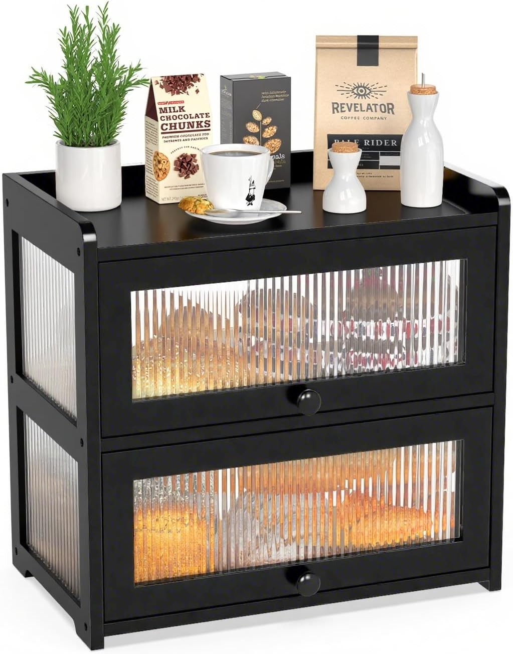 BAIRU Natural bamboo double-layer bread box with drawers, acrylic door, kitchen storage box, large capacity food preservation storage cabinet, environmentally friendly(Natural,63x38.5cm/25x15in)