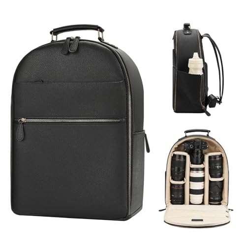 Divvia Camera Backpack Classic Leather with 15 Inch Laptop Compartment, Professional Camera Bag for Photographers for DSLR Large 20L Black