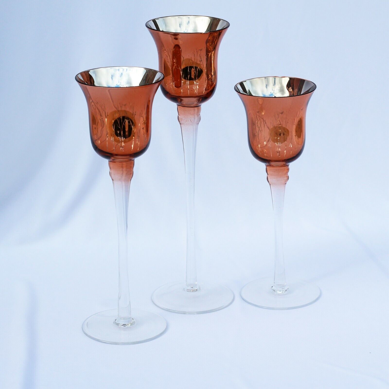 Set of 3 Tall Glass Large Candle Holders Centrepiece Tea-Light Copper Top Linear