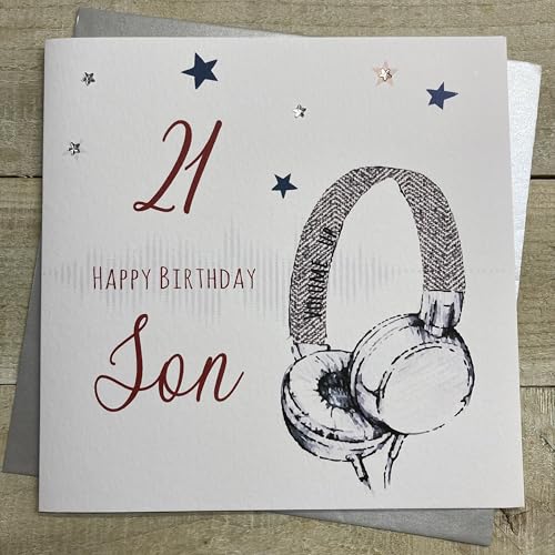 WHITE COTTON CARDS Large Handmade 21 Happy Son Headphones Birthday Card, White, XSB54-S21