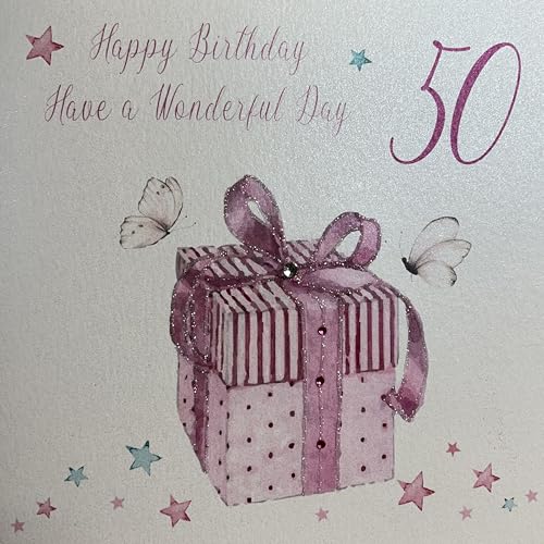 White Cotton Cards Large Happy Wonderfu Day, Pink Present Handmade 50th Birthday Card, XPB50