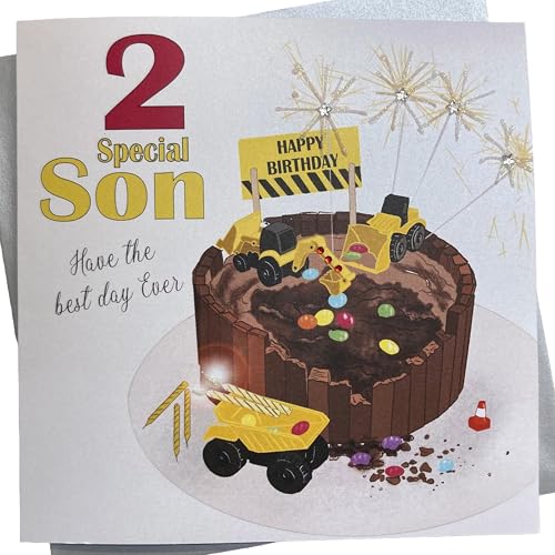 White Cotton Cards Large Diggers, Trucks & Chocolate Cake, Special Son Happy Birthday Handmade 2nd Birthday Card, XNA2-S NEW