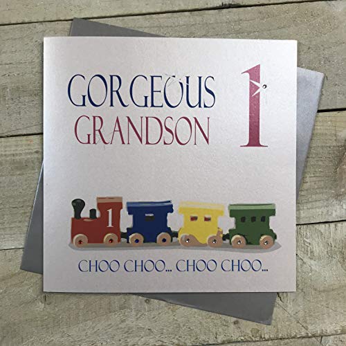 WHITE COTTON CARDS Large Train, Gorgeous Grandson 1 Choo.Choo Choo Handmade 1st Birthday Card, XN215-GS1