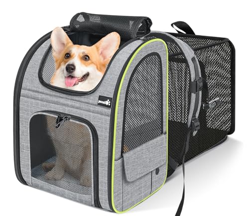 pecute Cat Carrier Dog Backpack Expandable Large, Portable Breathable Rucksack with Front Opening-Mesh Window-Pockets, Extendable Back More Space Great For Carrying Puppy Dogs Cats