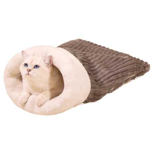 Self Warming Cat Bed Cave, Large Cat Sack Covered Bed with Cave for Kitten Puppy (Khaki, 21.65x18.9x5.1in)