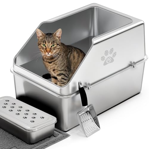 PTLOM Stainless Steel Cat Litter Tray with 11.8" High Rim, Large Metal Cat Litter Box, Prevents Urine Leakage, Non-slip and Odorless,Narrow Edge Opening Pet Cleaning Tool,19.4"x13.5"x11.8"