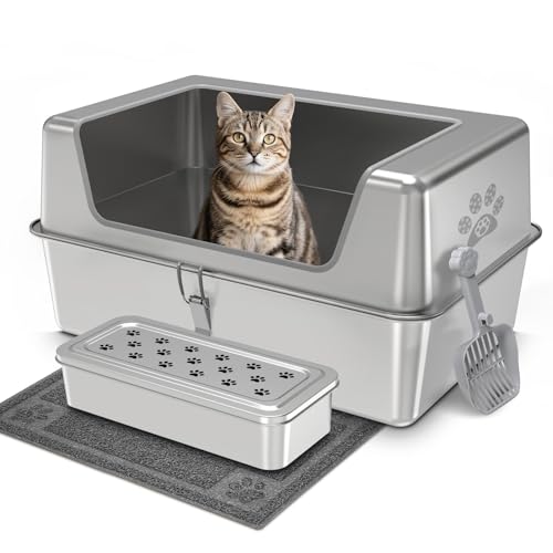 PTLOM Stainless Steel Cat Litter Tray with 15.7" High Rim, Large Metal Cat Litter Box, Prevents Urine Leakage, Non-slip and Odorless,Narrow Edge Opening Pet Cleaning Tool,23.4"x15.5"x15.7"
