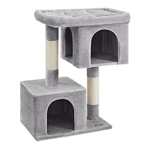 Feandrea Cat Tree, 67 cm Tower, S, Condo for Kittens up to 3 kg, Large Perch, 2 Cat Caves, Scratching Post, Light Grey PCT611W01