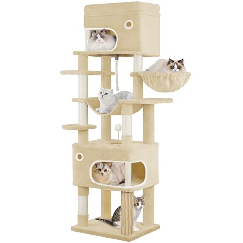 Hzuaneri 178 cm Cat Tree for Indoor Cats, Multi-layer Scratching Post with Large Platform, 2 Caves, 7 Sisal Posts, Pompoms, Cat Basket, Hammock, Suitable for Cats, Beige MS17818YL