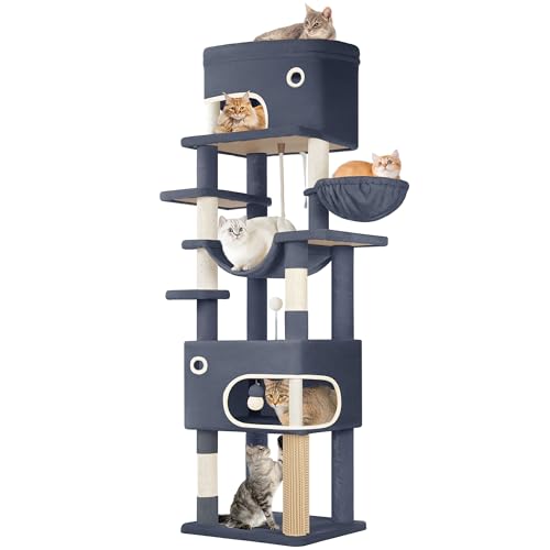 Hzuaneri 203 cm Cat Tree for Indoor Cats, Multi-layer Scratching Post with Large Platform, 2 Caves, 7 Sisal Posts, Pompoms, Cat Basket, Hammock, Suitable for Cats, Dark Grey MS20318SG