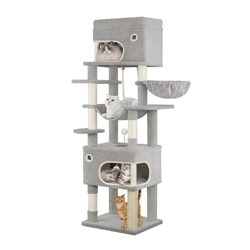 Hzuaneri 178 cm Cat Tree for Indoor Cats, Multi-layer Scratching Post with Large Platform, 2 Caves, 7 Sisal Posts, Pompoms, Cat Basket, Hammock, Suitable for Cats, Light Grey MS17818LG