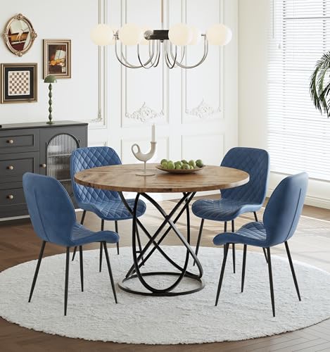 GOLDFAN Dining Room Set with 120cm Round Table and 4 Comfortable Velvet Chairs, Large Wooden Table with Chair for 4-6 People (01-Blue)