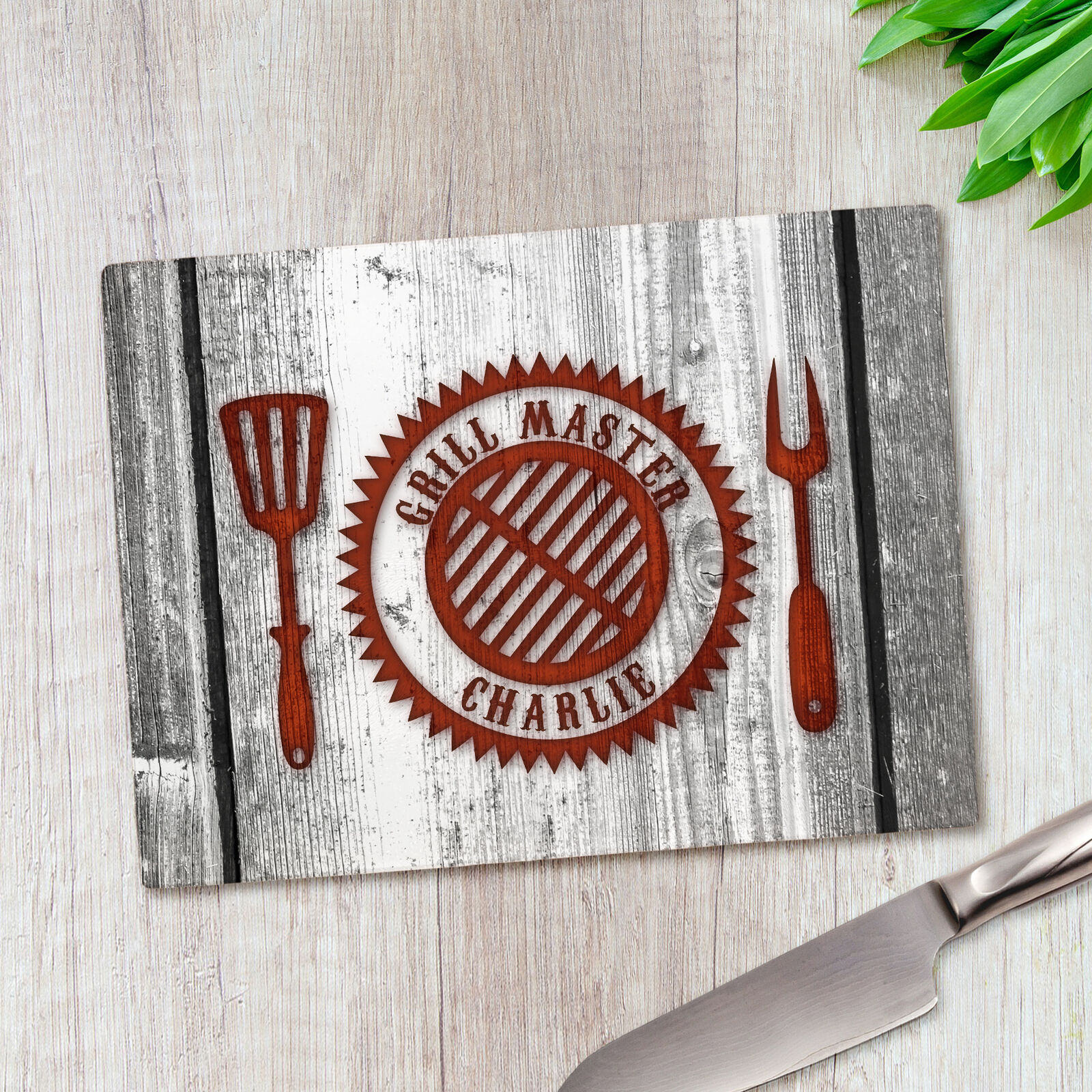 Personalised Grill Master Grey Any Name Glass Large Worktop Saver Chopping Board