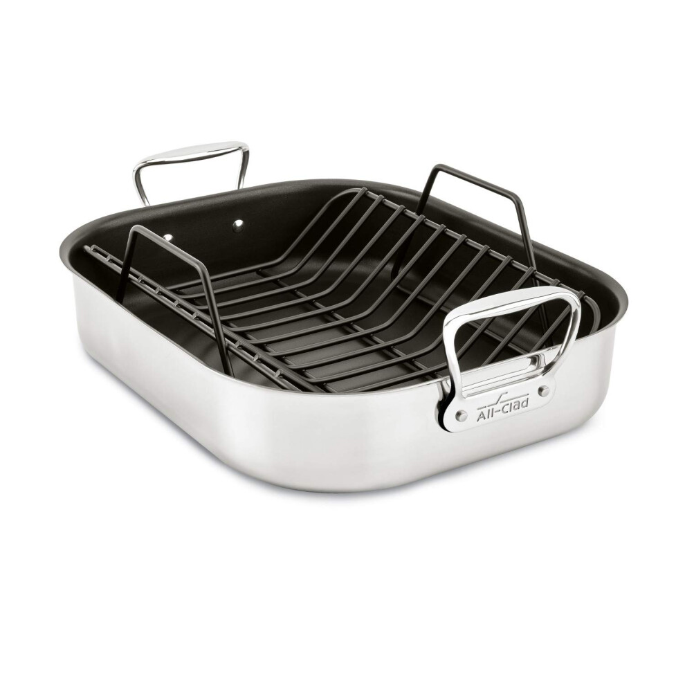 All-Clad Specialty Stainless Steel Large Roaster with Nonstick Rack 13x16 Inch Oven Broiler Safe 500F Roaster Pan Pots and Pans Cookware Silver