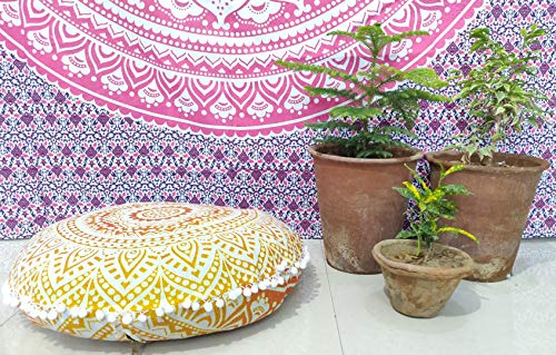 INDIAN CRAFT CASTLE 24" Yellow Ombre Mandala Barmeri Large Floor Pillow Cover Cushion Meditation Seating Ottoman Throw Cover Hippie Decorative Zipped Bohemian Pouf Ottoman Pom Pom Cases 24" Round