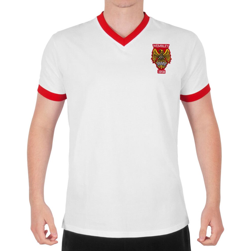 (White V-Neck Wembley 58 Crest, Large) Fan Originals Manchester Crest T-Shirt Mens Wembley United Retro Colours