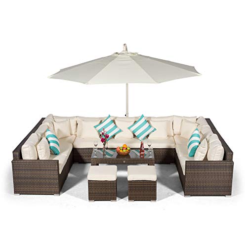 Monaco Luxury Large Brown Rattan Garden Sofa Set | 10 Piece Semi Circle Outdoor Poly Rattan Sofa Set | Fully Assembled Patio & Conservatory Wicker Garden Furniture with Parasol & Outdoor Cover