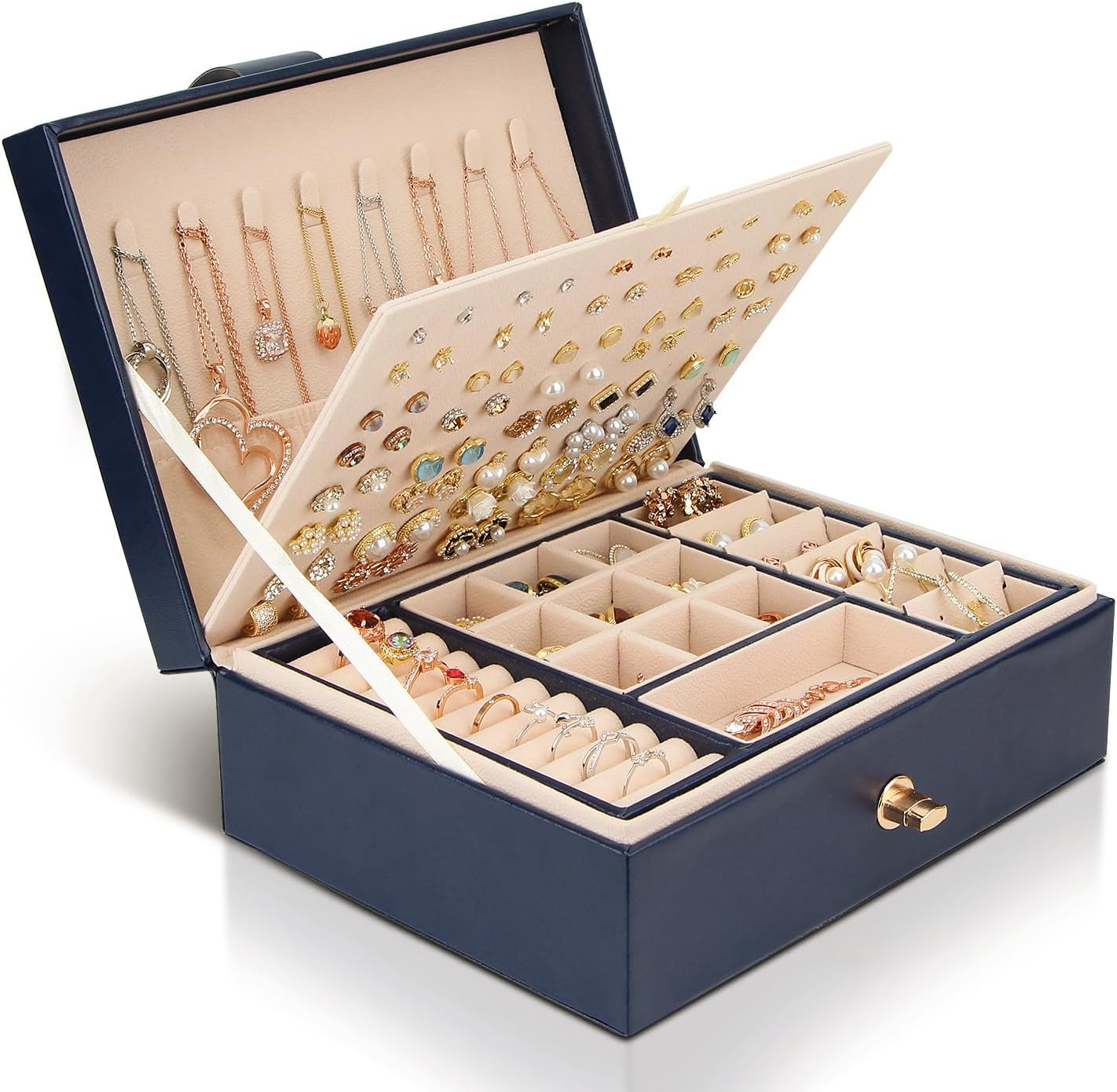 YONZONE Jewellery Box Organiser for Women Girls, 3 Layer Large Jewellery Case Storage with Removable Compartment for Necklace Earrings Rings Bracelets, PU Leather Travel Jewelry Boxes Gift, Dark Blue