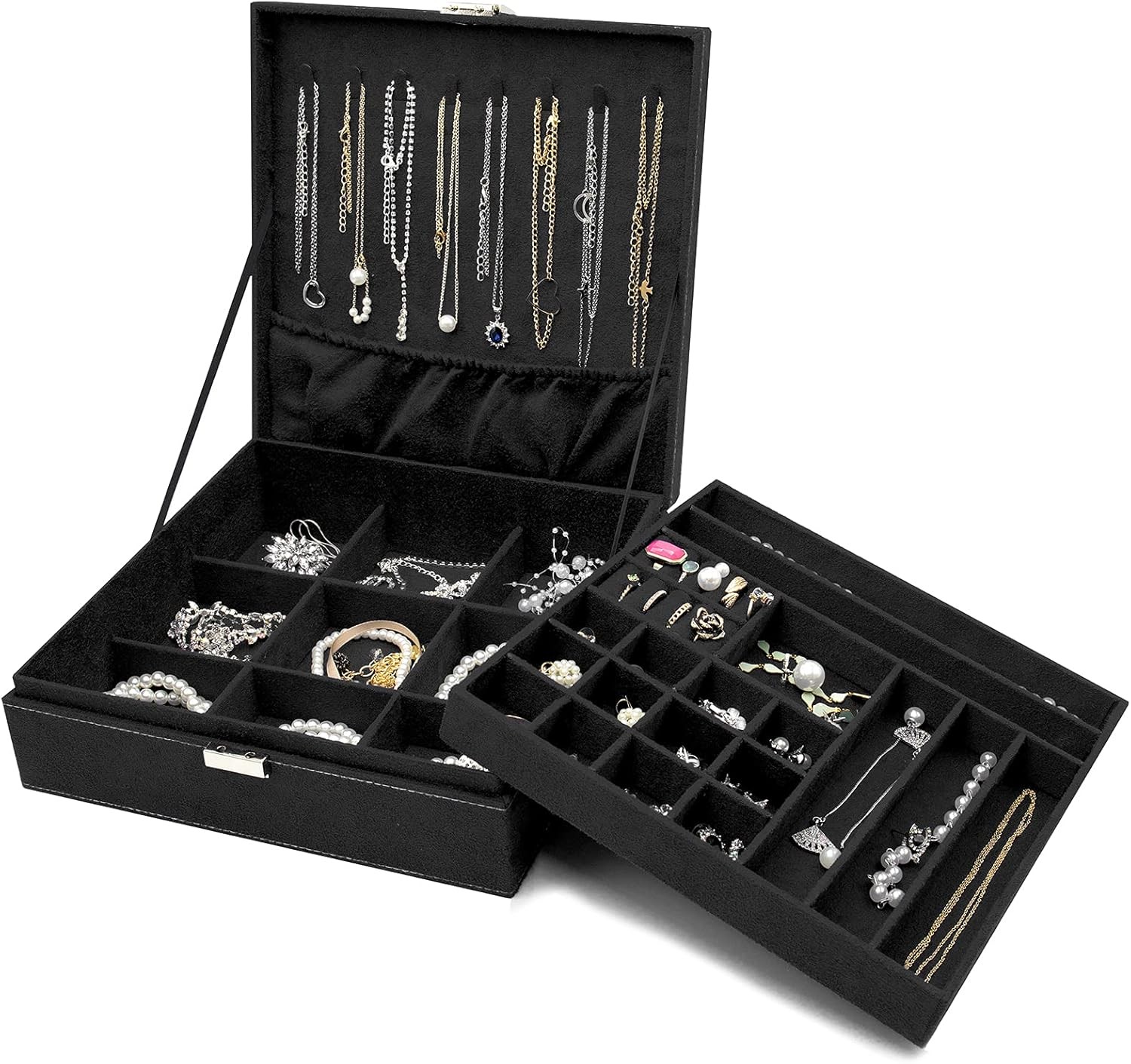 ProCase Jewellery Box Organiser, Large Jewellery Boxes with 2 Tiers, Gift Jewellery Storage Cases with Removable Divider for Earrings, Bracelets, Rings, Necklaces -Black