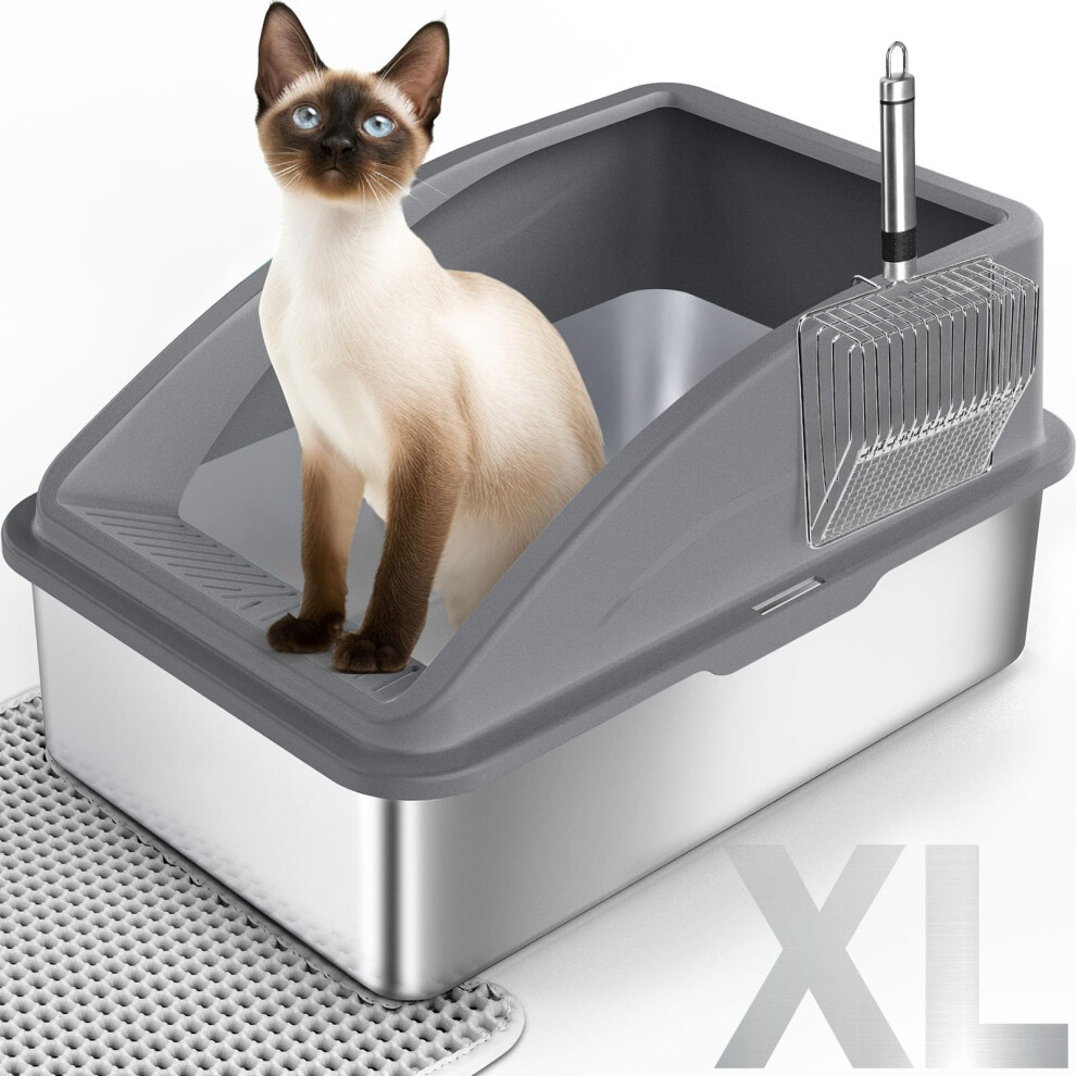 FURTIME XL Cat Litter Box Stainless Steel, Large Cat Litter Tray Stainless Steel, 20L Litter Box Tray with Litter Scoop & Mat, Good for Large Medium