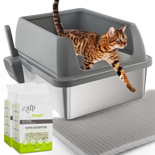 ALL FOR PAWS Enclosed Cat Litter Box Stainless Steel, Large Stainless Steel Litter Tray with High Sides, Litter Box with Litter Scoop & Mat &12L Tofu Cat Litter, Good for Large Medium Cats