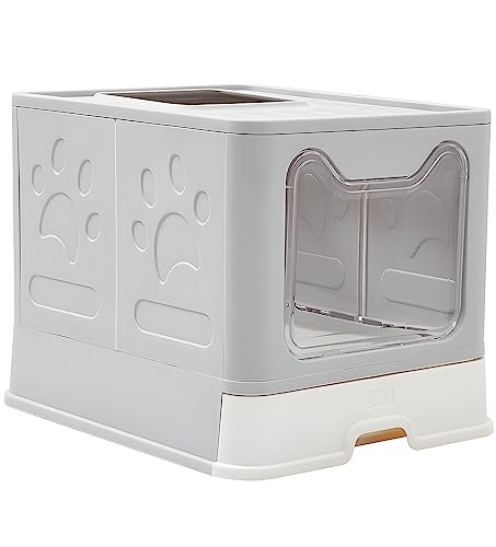 Fellie Foldable Cat Litter Box with Drawer Pan and Scoop, Large Space Hooded Litter Tray, Odor Control Easy Clean Box, 51 x 41 x 38 cm, Grey