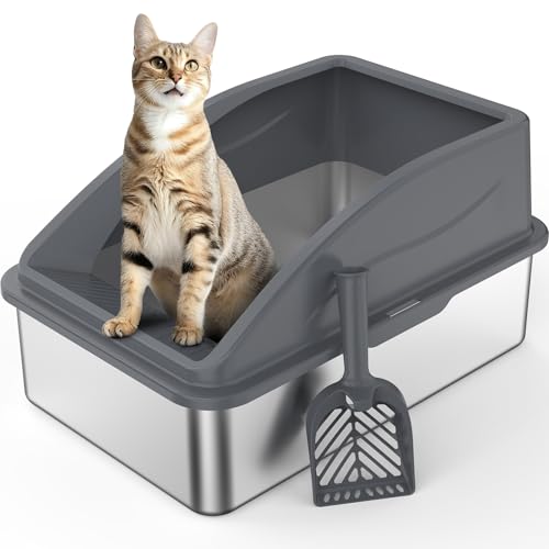 FURTIME Stainless Steel Cat Litter Tray Grey with Detachable Enclosure, 26cm High Sided Cat Litter Box Anti-Spillage and 58cm Extra Large Litter Tray for All Cats, with Litter Scoop, 58x37x26cm