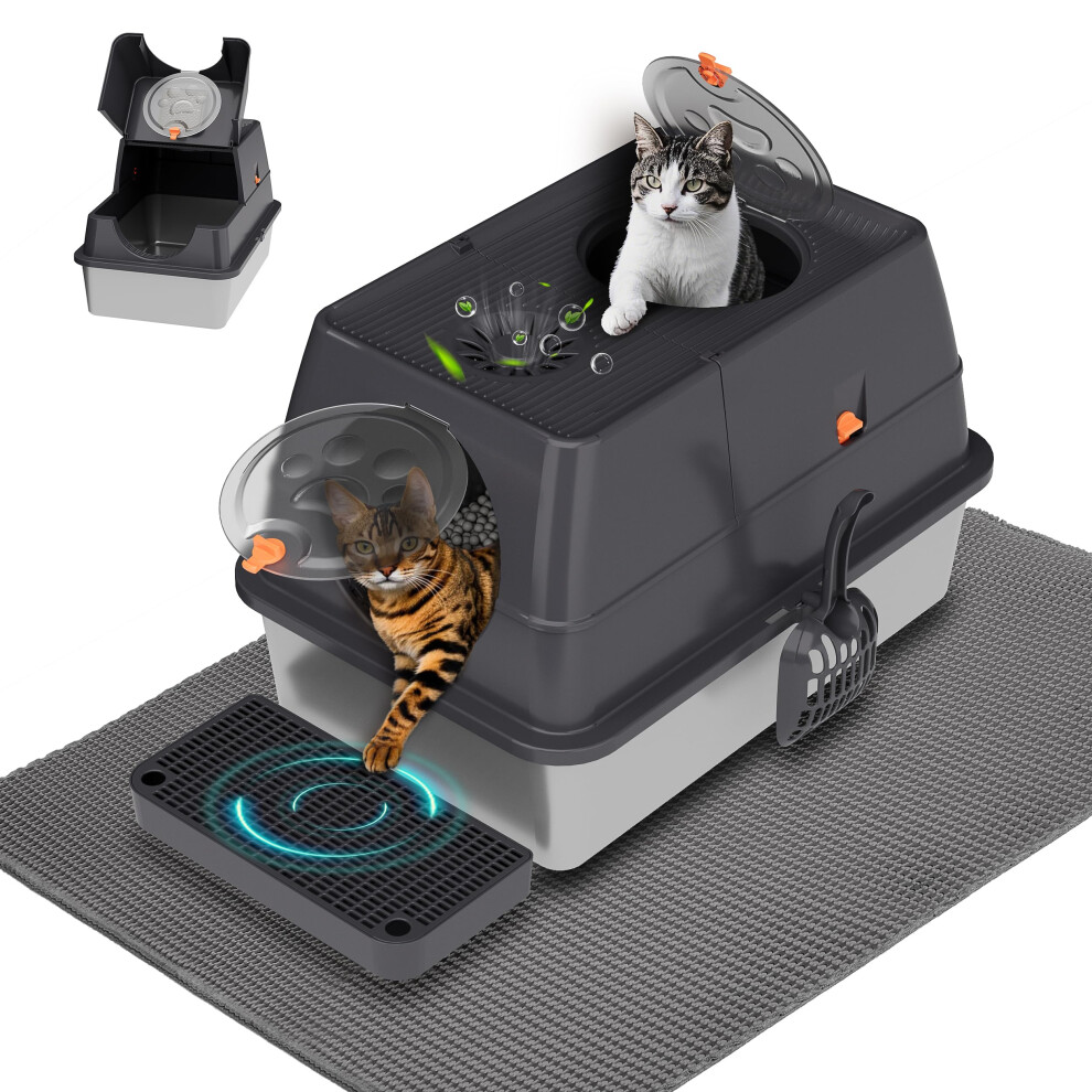 Citylife Stainless Steel Litter Box with Lid, Removable, Enclosed Large cat litter tray with Double Layer Litter Mat and Steps, Scoop, 120? flip-top