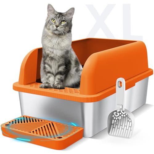 Enclosed Stainless Steel Litter Box with Lid Extra Large Litter Cat Box for Big Cats XL Metal Litter Pan Tray with High Sides Enclosure, Anti-Leakage, Easy Cleaning (Orange)
