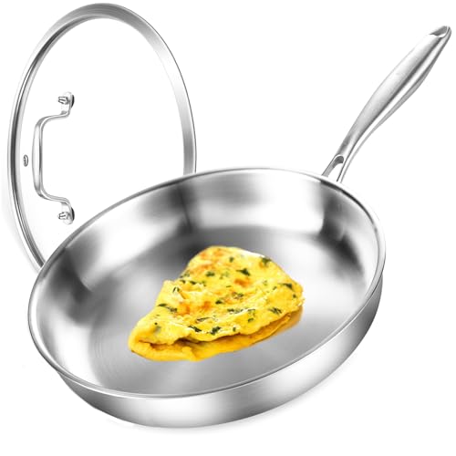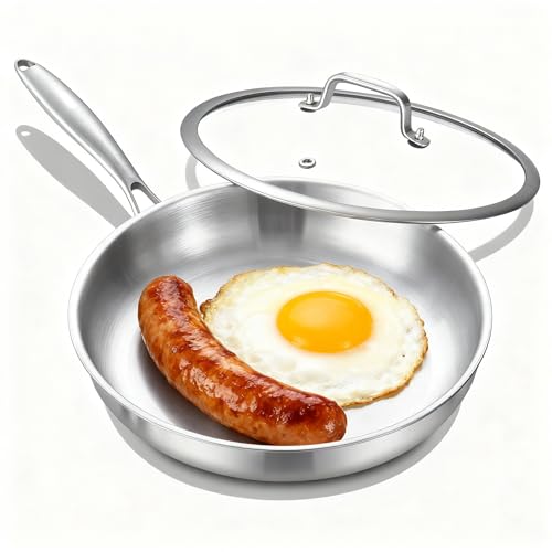 Nontoxicook 26CM Tri-Ply Stainless Steel Frying pan with Lid, Large Skillet 10inch, Induction Cooking Pan,Fast & Even Heat, Compatible with All Cooktops Up to 315℃