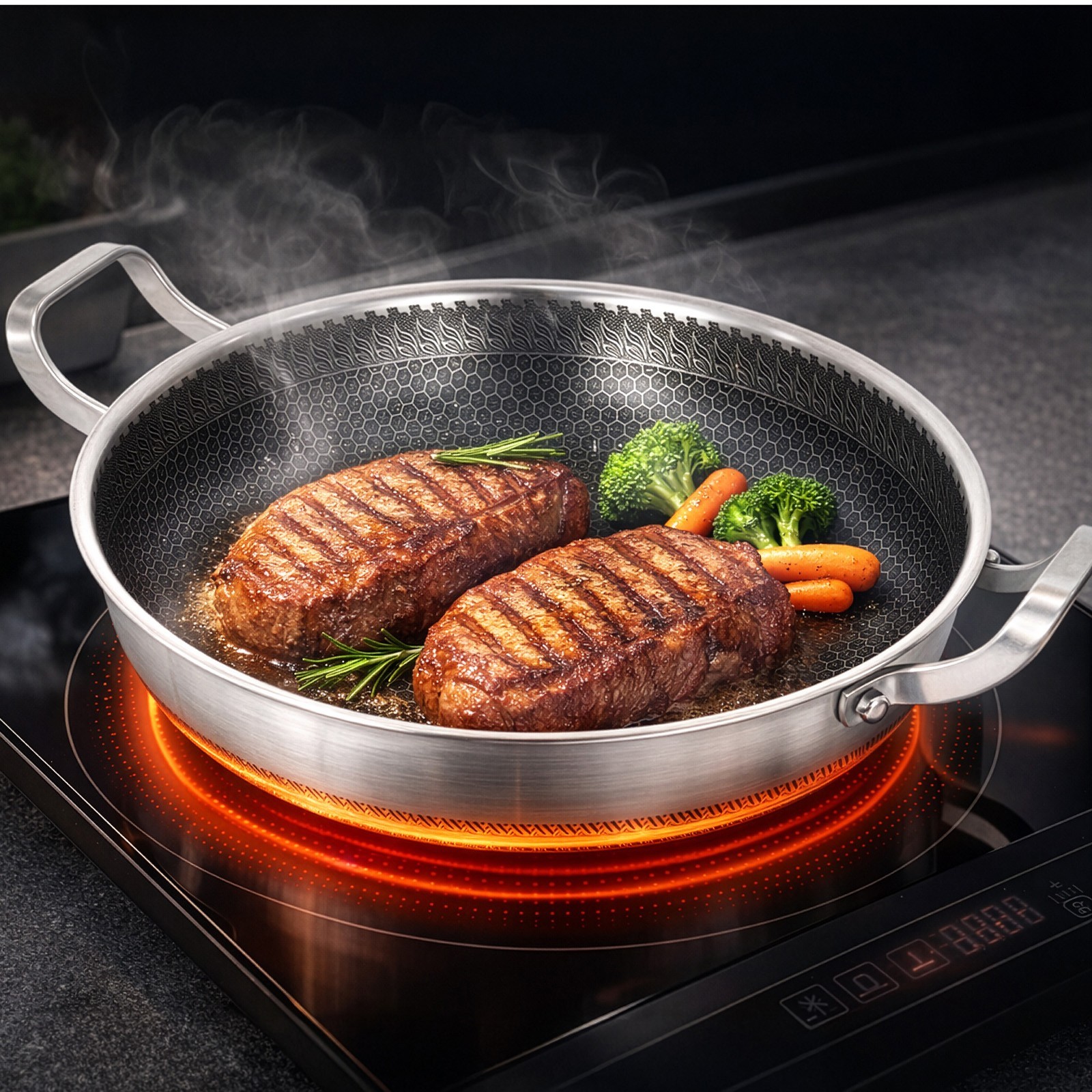 ROYDX Uncoated 18/10 Stainless Steel Cookware Set, Large Frying Pan Set with Steamer and Saute Pan, Stay-Cool Detachable Handles and Glass Lid, LFGB