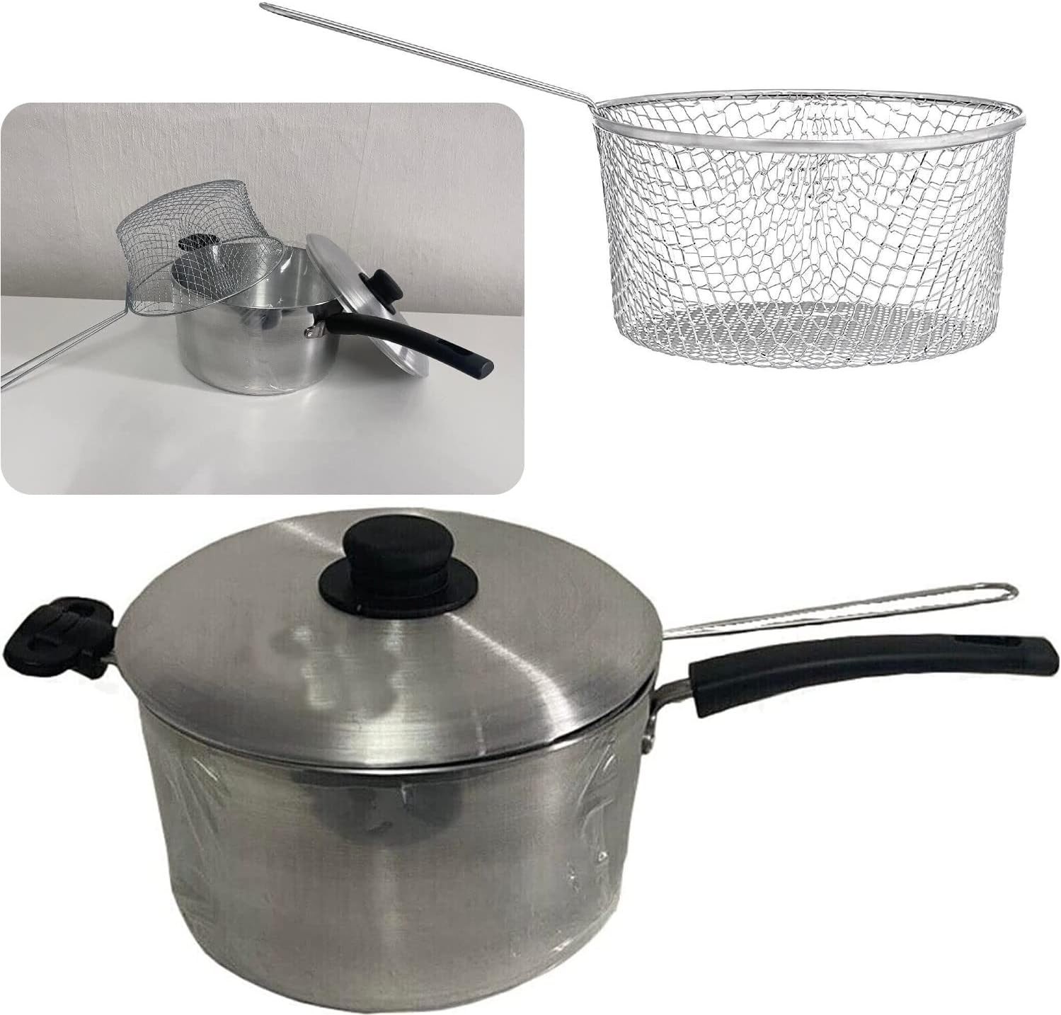 Large 24cm 3pc Steel Chip Pan Deep Fry Pot Fryer Dish Wire Basket Lid...