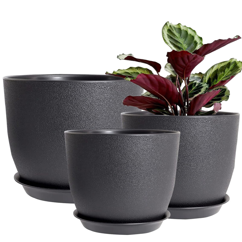 UOUZ 12/10/9 Large Modern Plant Pots, Plastic Planters with Drainage Holes and Saucers for Indoor Outdoor Plants Flowers, Black