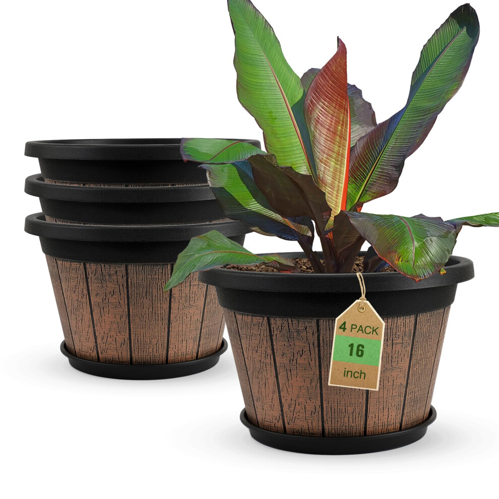 Quarut Large 4 Pack 16 inch Plant Pots Whiskey Barrel Planters with Drainage Holes Saucer Plastic Decoration Flower Pots Retro