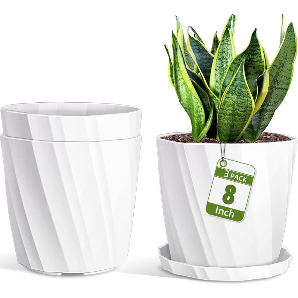 (As show, One size) 8 Inch Flower Pots 3 Pack, Plastic Plant Pots with Drainage Holes and Saucers, Tray. Large Planters for Indoor Plants, White Pots
