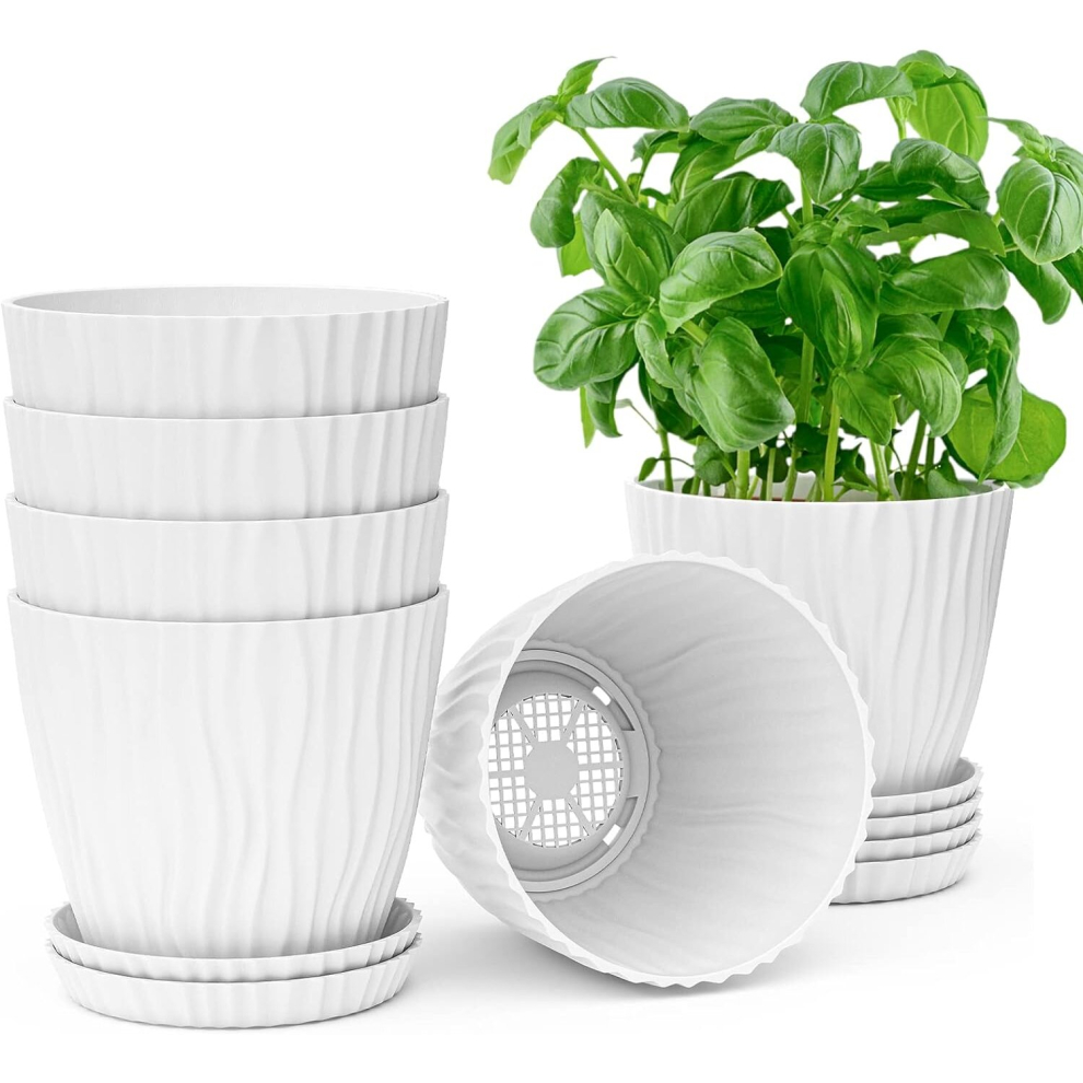 Plant Pot, 6 Pack, 7Inches White Plastic Pots with Drainage Holes and Saucers, Large Planters for Indoor Plant Pot Modern Decorative Planting Pots