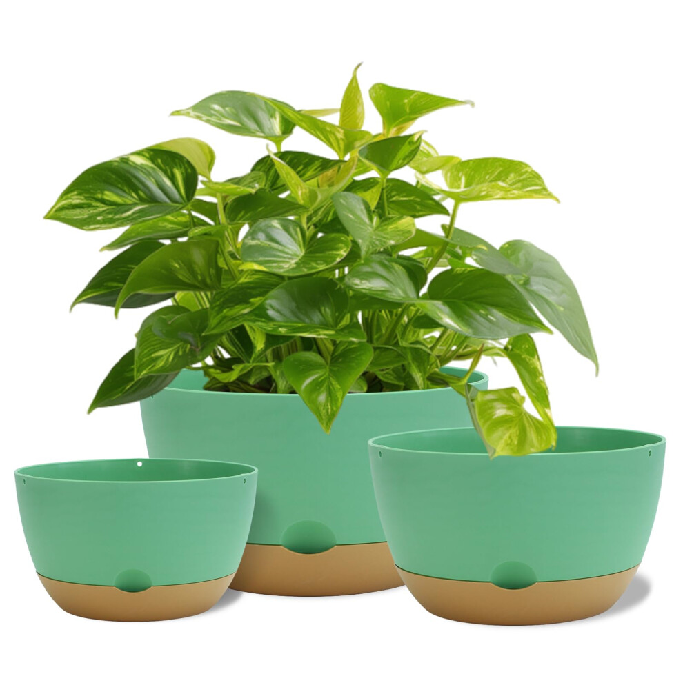 PROFIKLA 30cm, 25cm,23cm Plastic Plant Pots, Pack of 3 Planters, Large Plant Pots with Drainage Holes and Saucers, Modern Decorative Flower Pots, Green