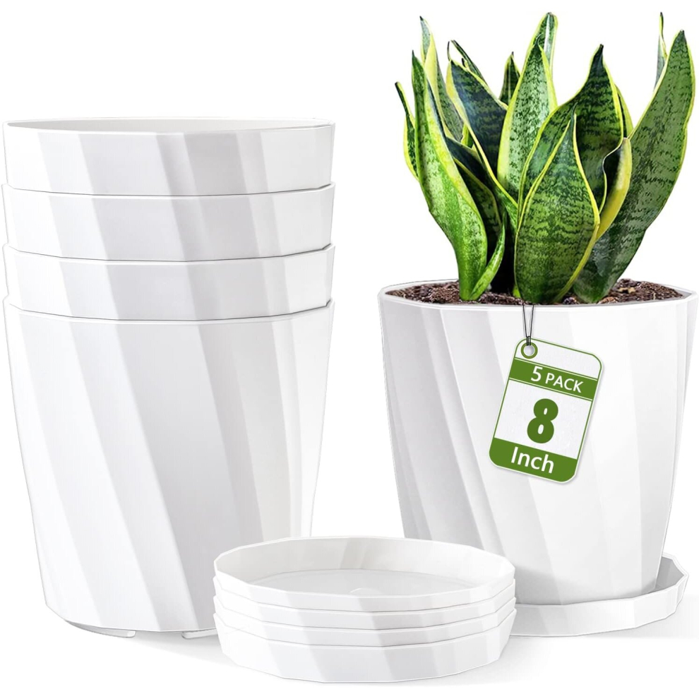 8 Inch Flower Pots 5 Pack, Plastic Plant Pots with Drainage Holes and Saucers, Tray. Large Planters for Indoor Plants, White Pots Set for House, Outdoor Plants, Orchid. Unique Decorative Planting Pots