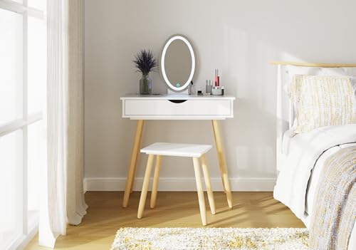 GFW Signy Dressing Table Set White. Make Up & Hair Vanity Table With Drawer, Large Round Mirror with LED Lighting. Stool included Modern Makeup Desk For Bedroom, H124 x W80 x D40cm. White/Oak