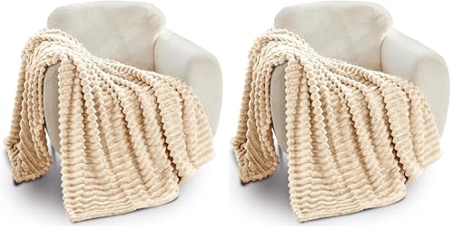 GC GAVENO CAVAILIA Ribbed Blanket Throw | Fluffy Fleece Throws For Sofas, Bed, Settee, Couch | Comfortable Extra Large Blankets & Throws | King Size 200x240 Cm | Cream (Pack of 2)