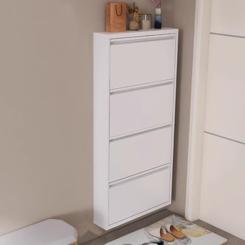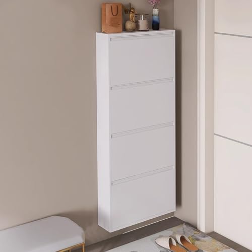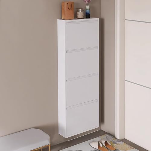 SoBuy Large Shoe Storage Cabinet with 4 Flip Drawers, Slim Shoe Storage Unit for Hallway, Entryway, Wall Mounted Wooden Cupboard, White 105x24x82cm FSR79-W