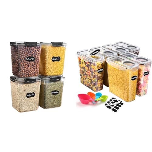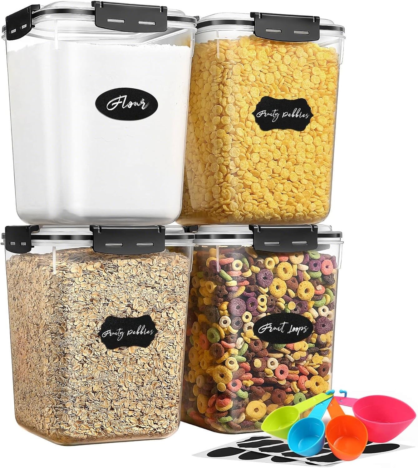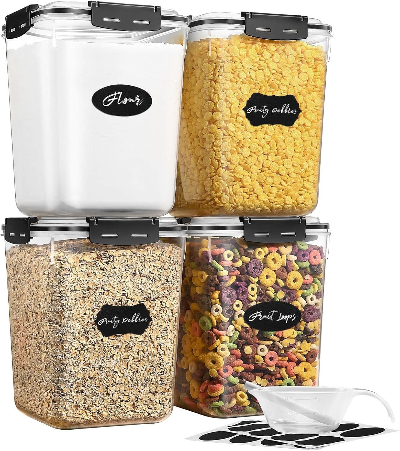 Vtopmart Large Food Storage Containers 5.2L / 175oz, 4 pack Plastic Airtight Storage Containers with Lids for Flour, Sugar, Rice, 4 Measuring Cups and 24 Labels, BPA Free, Black