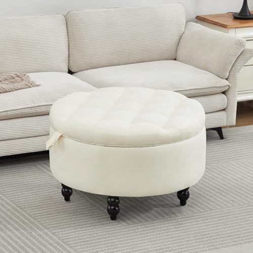 FOREDO 30 Inch Fabric Round Storage Ottoman with Tray, Modern Upholstered Tufted Coffee Table with Storage, Large Ottoman Footrest Stool for Living Room, Bedroom, Dorm, White