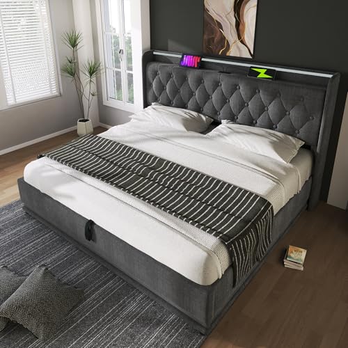 EINHOM Upholstered King Bed Frame with Large Storage Space, Ottoman Bed with 360 Degree Surround LED Feature, Charging Function, Linen, Grey (No Mattress) (150cm*200cm)