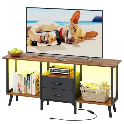 OYRREU TV Cabinet with LED Lights & 2 Fabric Drawers, TV Unit for 55 inch TVs, Large Storage TV Stand Cabinet with Open Shelves for Living Room & Bedroom - Rustic Brown