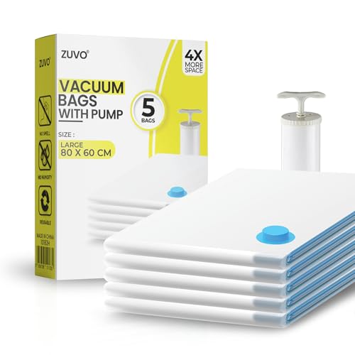 Zuvo Large Vacuum Storage Bags with Pump (Pack of 5) – Heavy-Duty Space Saver for Clothes, Bedding & Travel – Durable, Reusable & Airtight Compression Bags