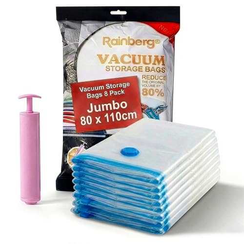 Rainberg Pack of 8 Large, Premium Vacuum Storage Bags, 80% More Storage, Vacuum Sealer Bag with Triple Seal Turbo-Valve for Max Space Saving in a Storage Bag (Jumbo, 80 x 110cm)