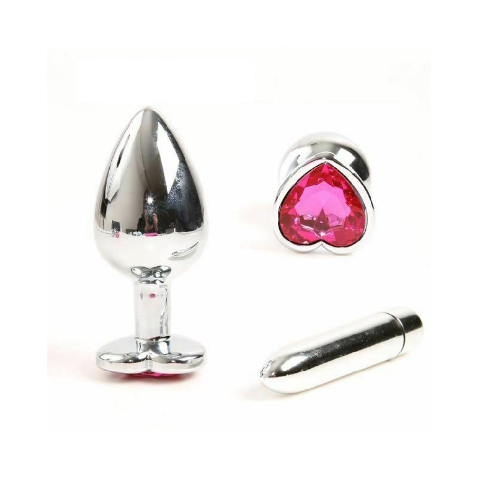 (Plug with vibrator, Large) Pink Heart Crystal Jewel Metal Butt Plug Three Size Mini Bullet Vibrator Anal Training
