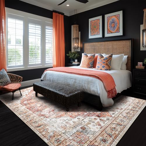 XSIVOD Orange Area Rugs for Living Room, Washable Large Rugs for Bedroom, Non Slip Vintage Rugs for Dining Room Office, Soft Low Pile Floral Rug Accent Floor Carpet for Home Decor, 240 x 300 cm