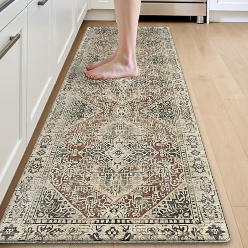 DEXI Kitchen Mat 60 x 220 cm, Anti-Fatigue Cushioned Standing Mats Non Slip Waterproof, Extra Large Washable Carpet Runner Rugs for Floor, Laundry, Home Office, Cream Red